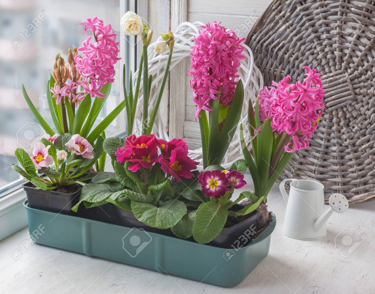 Box With Daffodils Hyacinth And Primrose On The Window Next