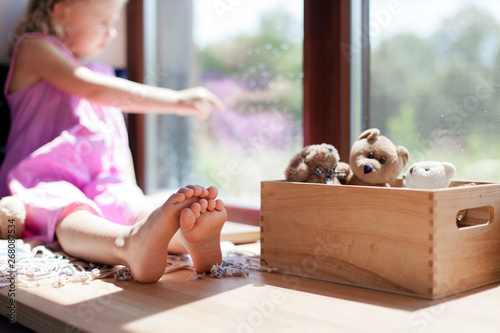 Child Is Sitting Barefoot On Window Sill At Home Kid Is