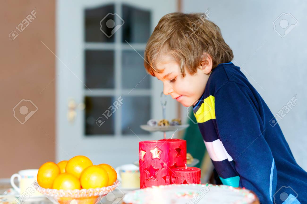 Little Kid Boy Standing By Window At Christmas Time And Holding
