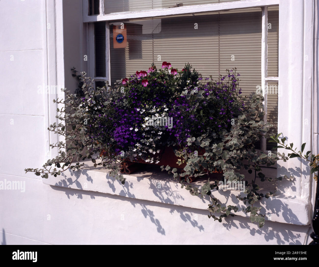 Close Up Of Blue Lobelia And Trailing Green Plants In Window