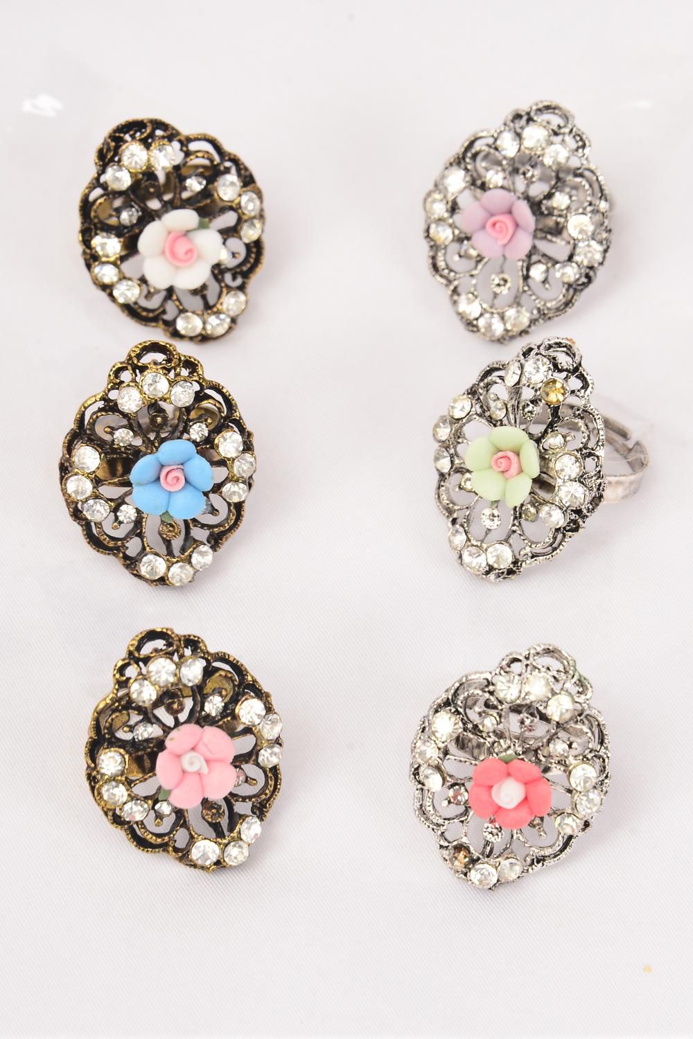 Rings Antique Poly Flower W Rhinestones Dz Adjustable